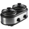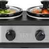 Cooking for a crowd has never been easier! Make two separate dishes, at two separate temperatures, in these two (2) crocks. Each removable stoneware insert has 1.25 quart capacity. Taco bar No problem! Taco meat in one side, beans in the other. Fondue party Cheese dip in one side, chocolate in the other. Football watch party Wings in one side, little smokies in the other. The possibilities are endless! The TRU Double Slow Cooker is a must for celebrations. New. Model SC-2125
