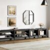 NOTE:This TV cabinet are sent in 3 packages,so you may receive them at different times.The black wood grain and simple lines on this tv stand make it look classic and elegant. It can be not only used as televison stands, also perfect for sofa table, entertainment center, media stand, storage console table, tv console etc. This TV stand is perfect for TVs up to 100 inch TV.8 open shelves with big capacity allow you to storage the books, magazines, CDs and any other media or gaming devices. The media console table made of high quality MDF which is durable and sturdy enough to be used for a long time. Plus, four wooden legs further enhance stability, preventing the TV stand from wobbling. Max load capacity: 260 lbs. The black entertainmen center for 90 inch tv with smooth surface is waterproof and easy to keep clean with a damp cloth. The tv table is 3.9 in high height off the ground which adequate for robot vacuum cleaner can passing freely. No more headaches from dust under the cabinet.