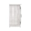 - Side cabinets feature rustic design with barn door mullions and two adjustable interior shelves each