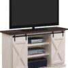 Enjoy modern farmhouse charm with this TV stand for flat screen TVs up to 60 inches and 50 pounds. Its unique saw cut style and innovative sliding barn doors will help you create a look everyone will love. Those unique doors conceal two side cabinets, each with two adjustable shelves for ample storage space. The open center shelf area also has two adjustable shelves, making more than enough room for gaming consoles, media components, and accent pieces you love to show off. Back panel cutouts help control wire tangles and provide ventilation for cooling components.