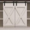 - Sliding barn-style doors conceal a storage space to keep side cabinet storage out of sight