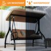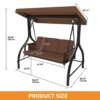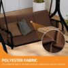 The patio swing is made from a durable steel frame and the canopy is made from polyester fibre which is waterproof and UV resistant. The canopy can be adjusted by turning the knobs on the side. The patio swing can carry up to 3 people at a time and has a maximum weight capacity of 595 lbs. The Teslin fabric cushions come with breathable thick pillows and ergonomic armrests. Trays on both sides hold drinks, mobile phones and belongings