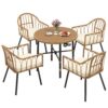 A exquisite ensemble comprising 5 pieces for outdoor dining, featuring 4 rattan wicker dining chairs paired with a round table designed with a convenient umbrella hole. Ideal for garden, lawn, and patio settings, this set exudes charm and functionality, enhancing outdoor spaces with its inviting presence.