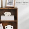 – [Adjustable Shelves] Each of the first 2 shelves can be adjusted to 3 height positions (up or down 1.2″), making the shelf spacing adjustable between 8.7-11″, so tall books, artwork, or storage boxes can easily fit in this bookshelf