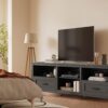 – Ample Storage Space Each cabinet has an adjustable shelf with 3 heights to fit items of different sizes, providing customizable organization for CDs, DVDs, gaming cards, media players, remote controls or home decor. This large entertainment console has cable holes designed in the back for stowing away cable extras. 70″L x 15.3″W tabletop supports 50, 55, 60, 65, 70, 75 or 80 inch TV.