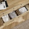 This dresser is a striking blend of simplicity and functionality. The dresser comes with 8 drawers, offering ample storage space for various items. It is built on solid wood legs that not only add to its aesthetic appeal but also ensure its stability and sturdiness. To enhance safety, the dresser is equipped with an anti-tip device at the back, providing extra support and preventing any potential tipping over. Its oak color gives it a clean, sleek look, making it a versatile piece that can blend effortlessly with any room decor.