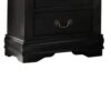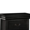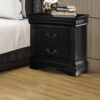 This nightstand’s vintage inspired details add storage with traditional appeal to any bedroom space. Constructed of select veneers and hardwood solids in a black finish, the spacious nightstand offers two drawers for you to store your reading books, reading glasses, and other belongings at an arms length away when you are in bed. Complete with shaped molding, bracket feet, and antique bronze color bail hardware, the nightstand has relaxed yet timeless style. Note: Other featured items in image except this Nightstand are sold separately.