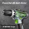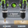 – 18+2 Torque Adjustment – This 20V Drill Driver can provide powerful torque and also allows you to choose between two speed settings (0 360 RPM or 0 1,300 RPM), so you will always have the power you need. The clutch has a total of 18 different torque settings and 2 modes (driving, drilling), in order to avoid incidents where you apply too much power and then wind up stripping the screw. 1-6 Torque for small size screws; 7-12 Torque for middle size screws; 13-18 Torque for large size screws.Drilling mode is designed for drilling wood, plastic, metal, etc. Hammer drilling is perfect for drilling cement brick, tiles, etc.